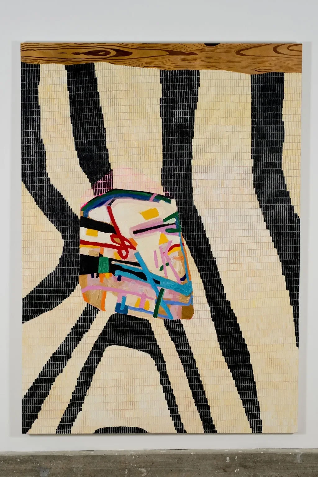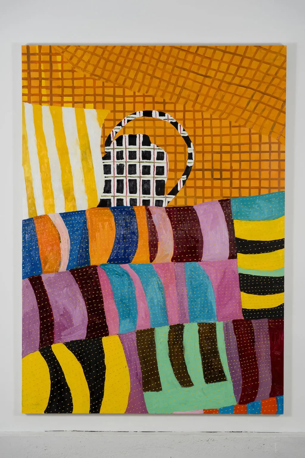 I have had such conversations with artist Brooke Pickett, a Louisiana native for whom “home making” is a creative practice. During a recent studio visit, she tells me about choosing new kitchen tiles for a home she knows will flood again, a process she compares to “rearranging chairs on a sinking ship.” She adds solemnly: “Home is a false promise of safety.” And yet, we titter for joy over kitchen tile selections and wall paper samples. The mammoth paintings surrounding our chatter assert a delightful friction, dissonance, and disorientation of pattern and shape. My eye finds what could be read as abstracted cheese graters, telephone cords, teakettle handles, and open umbrellas, all layered with checkered rugs, striped seat cushions, and stitched blankets that obey their own notion of perspective and horizon line. The artist describes the desire to explore and then collapse space in each work while giving her subject matter a “dazzling camouflage effect” or “the Betty Woodman treatment.”