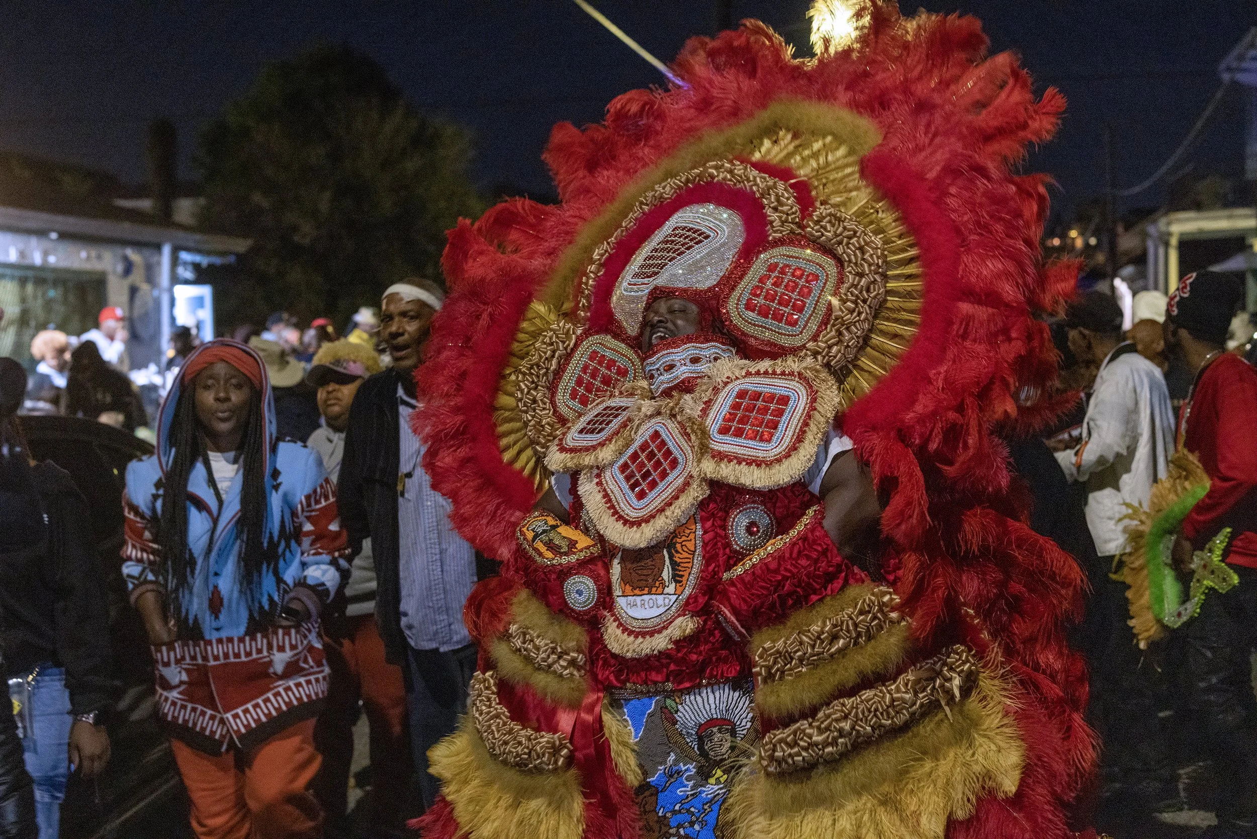 “New Orleans is a culture that is marketed globally but is not invested in with the same intentionality. You have Black Masking Indians who may struggle to buy supplies for the beading, and the feathers and all those things are very expensive,” Harris said. His piece, From Silky’s to Sportsman’s Corner, and the Streets in Between Harry G on St. Joseph’s Night, shows vibrant red, gold, and silver beadwork, stitches, and storytelling on Harry G.’s regalia. Surrounded by community members, the Black Masking Indians are pillars in New Orleans’s Black culture.