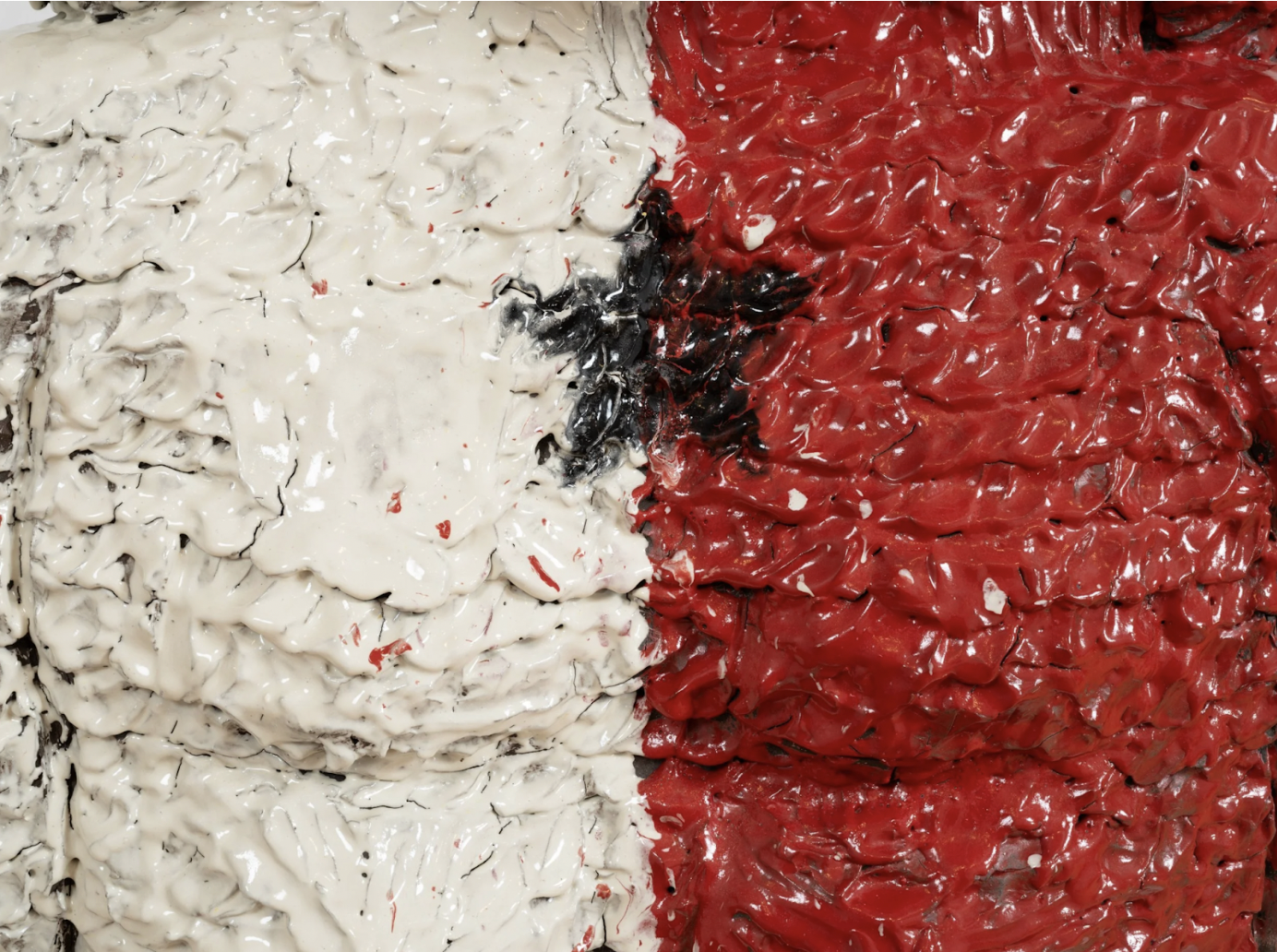 In the work America’s Sweetheart, a new flag is raised. A tall woman leans forward, her body a stack of dripping stripes. Armless, she echoes goddess statues of Greek or Roman antiquity. Halfmoon’s new divinity acknowledges, but ultimately refuses, this lineage. Hers is a defiant priestess, dusted by ancient stars. Red sits at her hips, a potent root from which she draws her strength. Recontextualizing this Western iconography, its power is alchemized.