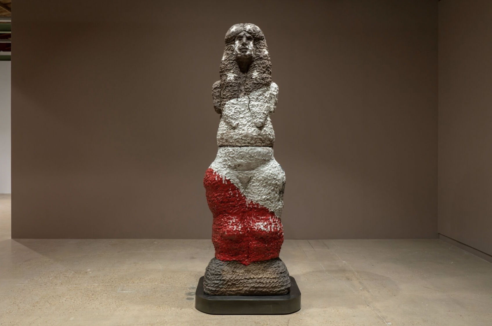 Raven Halfmoon, America’s Sweetheart, 2022, stoneware and glaze, 102 x 32 x 24 inches. Installation view, Raven Halfmoon: Flags of Our Mothers, The Contemporary Austin – Jones Center on Congress Avenue, 2024. Image courtesy The Contemporary Austin. Photograph by Alex Boeschenstein.