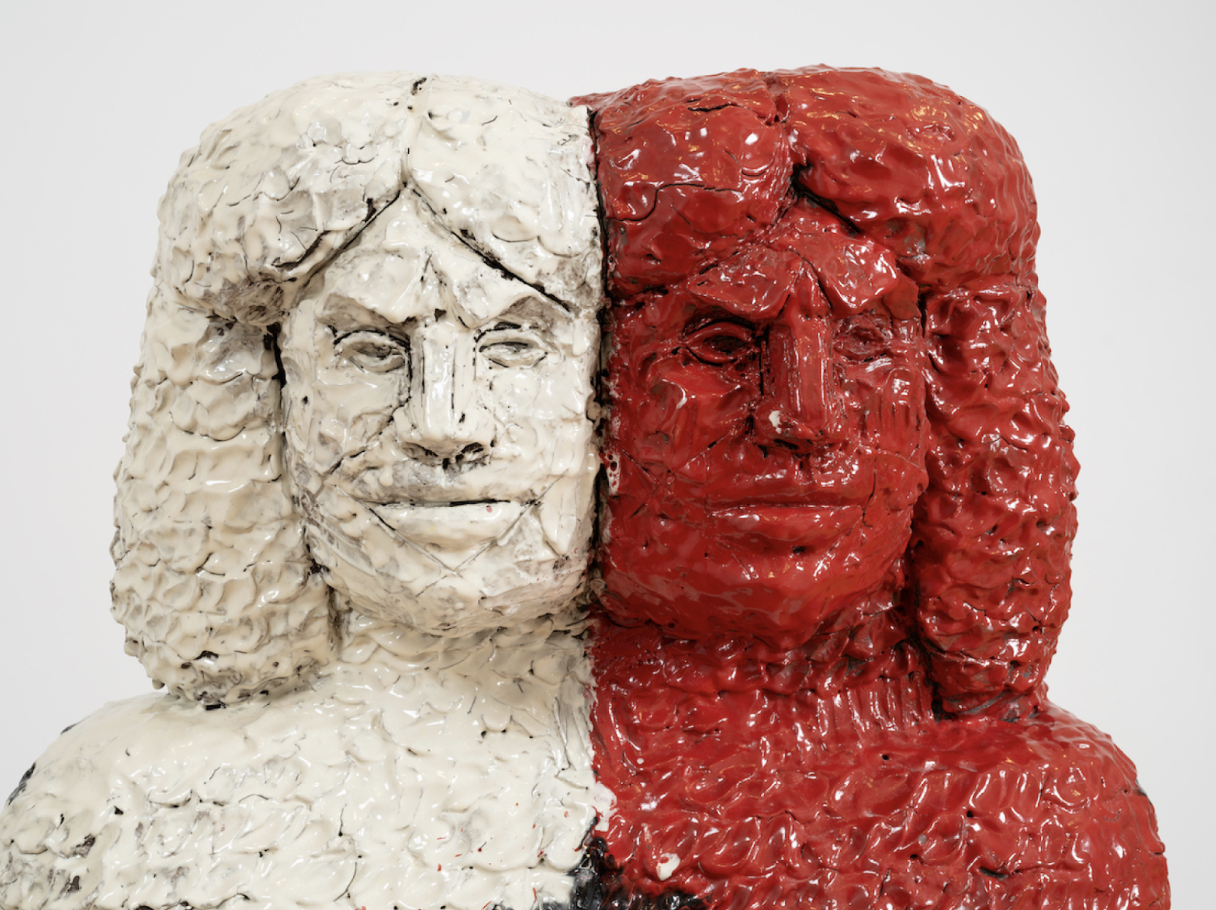 Halfmoon’s sculptures are new American monuments possessing a vitality absent in the established monument tradition. Each of her figures has an unmistakable presence, and I feel them teaching me about integrity, about how to be a woman who extends beyond her body instead of shrinking into it. Halfmoon’s work venerates her Caddo matriline. Red is her partner in this act of devotion, giving form to memory, inheritance, and accusation. In one sculpture, red is power; in another it is familial love; in another yet, under the bloodshot eye of a dying horse, it is sickeningly sad. Communicating through this fluid vocabulary, Halfmoon expresses the complexity of Indigenous womanhood.